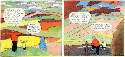Typically in old newspaper comics the color registration [...] was pitiful and the ink saturation weak.I remember a time when I liked the out of register colors. This may be linked to the modernist idea that artists should show their process, but it's more likely that I wanted to see fallible human hands behind the machinery. I like imperfections. I may admire the craft involved in folk art, but it's the naivete that I find appealing. Anyway, all this has nothing to do with coloring... As for the weak saturation, I rather prefer it because it respects the drawings. Highly saturated or highly shaded colors provoke a muddiness and a visual heaviness that I find unappealing as we have seen in my last post. Thankfully I don't need to deal in this post with that scourge of recoloring: computer generated gradients!...