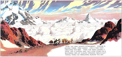 Hal Foster, "Prince Valiant" Sunday page (panel), April 22, 1951. Hal Foster was a great landscape artist, but that's all... Notice also the great coloring job.