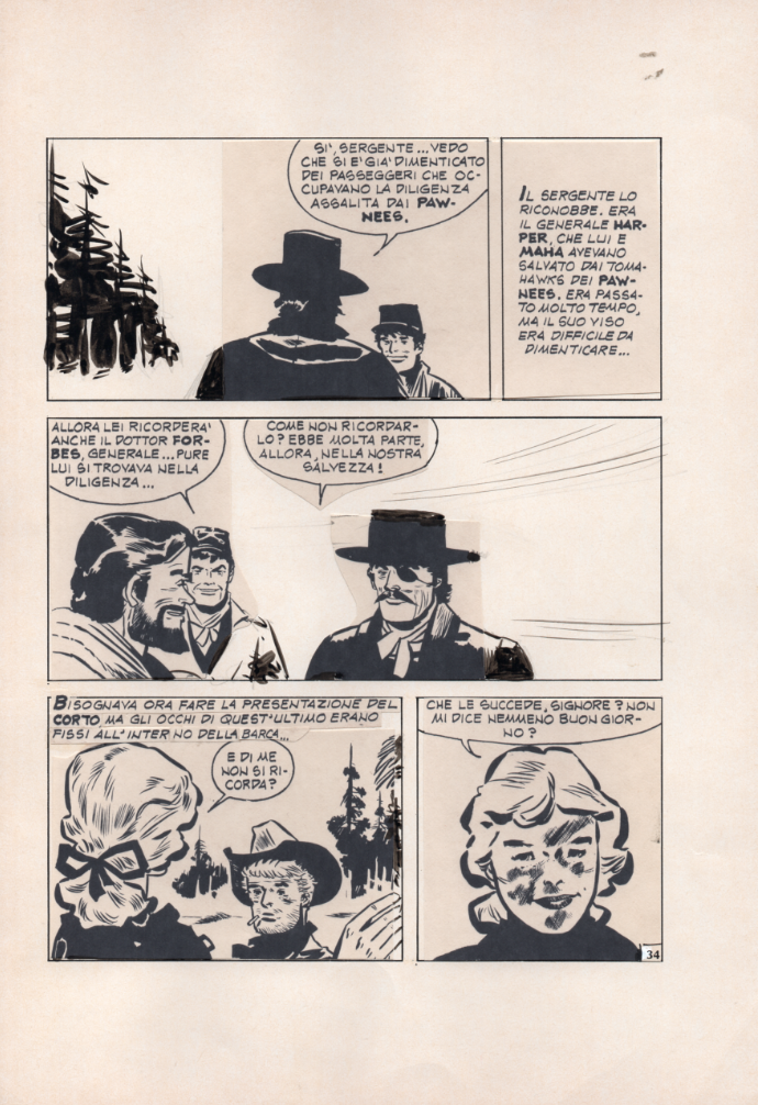 Héctor Germán Oesterheld (w), Hugo Pratt (a; with someone else?), "La barca del Missouri" [the Missouri barge], Kirk Western # 1, 1976 (mock up for page 34).