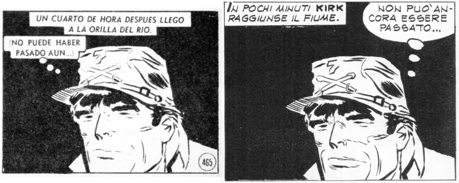 The line quality may be mediocre, but if you can read Spanish, you'll notice how elegant the caption is. Compare it to the ugly utilitarian and redundant caption in Italian. Isn't it a crime against the Castillian language that one of its best writers was ignored being Sgt. Kirk translated (!) in Spain from the Italian? Imagine people in the UK having access to Shakespeare's plays only through, say, translations from French translations! Only in the comics milieu, with our pitiful comics publishers, is such a thing possible.