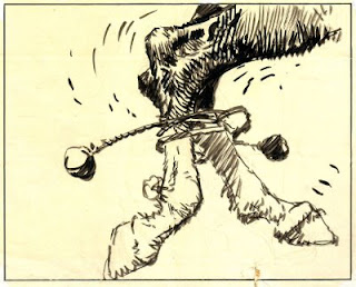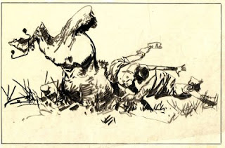 2. ...published repro: Carlos Roume drew with a thin brush on light weight matte, coated paper; this technique gave his lines a wonderful impressionistic fluidity; the lines' values vary from light grey to deep black; all this is lost in the repro on cheap pulp paper;