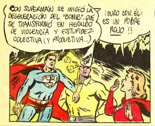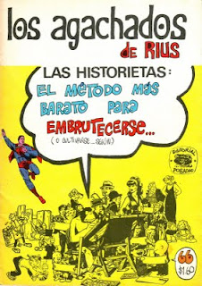 Cultural studies is a discipline that started in England by the hand of Richard Hoggart during the fifties. Even if it mostly relies on almost the opposite view now (mainly because of theories developed around Bowling Green University in the United States), Hoggart "lament[ed] the loss of an authentic popular culture and [...] denounc[ed] the imposition of mass culture by the culture industries." (As we can read in his wiki entry: http://en.wikipedia.org/wiki/Richard_Hoggart). The previous decade Dwight MacDonald expressed the same ideas in his mag Politics (there's also the Frankfurt School, Max Horkheimer and Theodor Adorno: http://tinyurl.com/oqxtqk). Rius follows these views, but he was a comics artist so, he has to see some good in comics too (ditto Umberto Eco, more or less around the same time). What he denounces are the violence and stupidity of some comics made in U.S.A. (superhero comics, mainly; in France he denounces the cheap use of sexploitation), the greediness of publishers and the stupidity of the audiences: "Mientras peor es la pelicula. Más larga es la cola..." (the worst the film is, the longer the line to attend it - my translation).