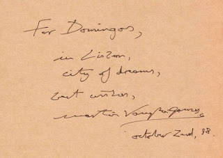 Martin Vaughn-James' The Cage's cover (Coach House Press, 1975; a little strip is missing at the bottom); Martin's inscription in my copy of The Cage: For Domingos, in Lisbon, city of dreams..