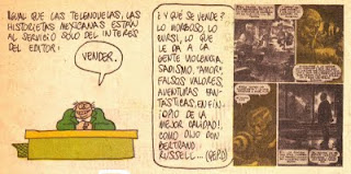 6. Rius also wrote in Las historietas about Mexican comics; he's critical of them because either they're imported from Gringo country or they're done in Mexico copying Gringo's ways; "In the same way as fumettis [telenovelas] Mexican comics serve the publishers' only interest" / "To sell." / "And what sells? What's gruesome, vulgar, what gives people violence, sadism, "love," false values, fantastic adventures, in a word..As Mr. Bertrand Russell (R.I.P.) put it: Opium of the best quality!"