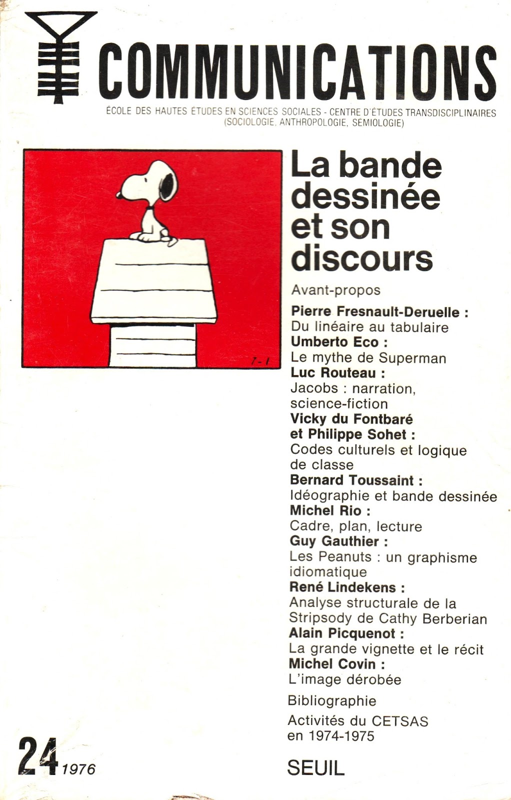 One of the first avenues that comics used to enter academia was structural and semiotic analysis (or semiological, if we are not Peirceian but Saussurian). The aforementioned Umberto Eco is a very important semiotician. Other books in this category are: A Explosão Criativa Dos Quadrinhos by Moacy Cirne (1970); El lenguage de los comics (1972) by Roman Gubern; Dessins et bulles: la bande dessinée comme moyen d'expression (1972) and La bande dessinée: essai d'analyze sémiotique (1972) both by Pierre Fresnault-Deruelle; "La bande dessinée et son discours" an anthology published as number 24 of the journal Communications (1976) with essays by Fresnault-Deruelle, Umberto Eco Luc Routeau, Vicky and Philippe du Fontbaré Sohet, Bernard Toussaint, Michel Rio, Guy Gauthier, René Lindekens, Picquenot Alain Michel Covin; Structuren des Comic Strip (1974) by W. Hünig; Récits et discours par la bande (1977) by Pierre-Fresnault Deruelle, again. We can find the formalist tendency in more recent books such as Case, planche, récit: comment lire une bande dessinée (1991) by Benoît Peeters. The structuralist tendency can still  the detected in the overrated Understanding Comics (1993) by Scott McCloud (McCloud and Will Eisner, who wrote two books on the language of comics, plus Benoît Peeters, are artists, not academics; it's quite natural to write about their practice because they face formal problems every day). Traces en cases by Philippe Marion and Pour une lecture moderne de la bande dessinée by Jan Baetens and Pascal Lefèvre were also published in 1993. Ten years later, in 2003, Principes des littératures dessinées by Harry Morgan was published (I include this book in this list even if the author contests his predecessors of the 1970s). In Italy Umberto Eco has left at least one disciple: Daniele Barbieri, who wrote I linguaggi del fumetto (1991). A curio, just to demonstrate that the periphery also moves is Tralala del Comic (1997) published in Santo Domingo by Faustino Perez. But the best book in this category was mentioned already. It's Système de la bande dessinée (1999) by Thierry Groensteen. Rui Zink's thesis Literatura Gráfica? (1999) is a mixture of many approaches, but the formal theory is also present.
